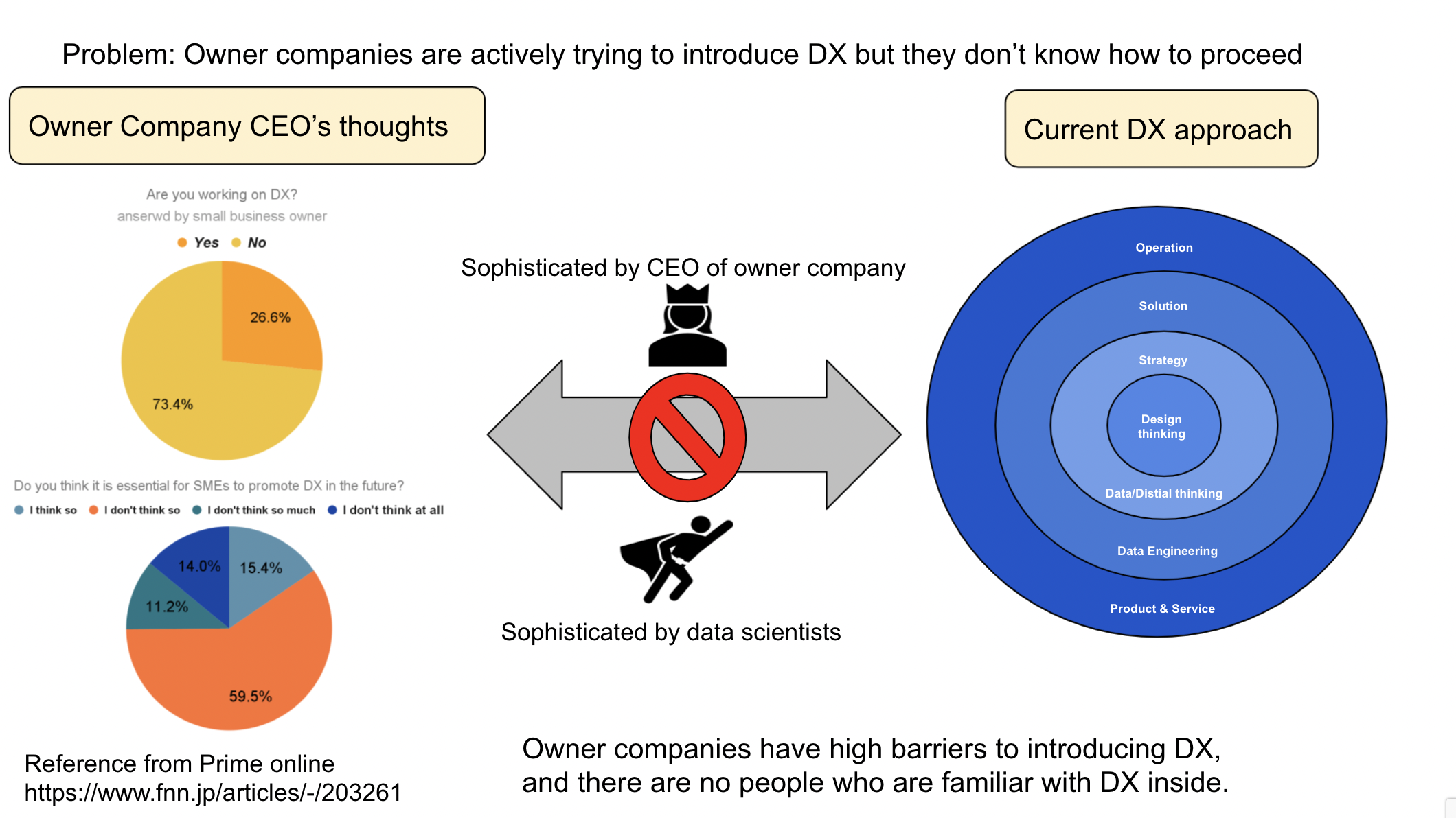 日本のオーナー企業は特にDXの導入に遅れをとっています。 CEO自身もDXを理解していなかったり、 DXを宣伝するために外部から人材を求めても採用が難しく、社内に経験豊富な人材がいないために進まないなどの問題が多く見受けられました。